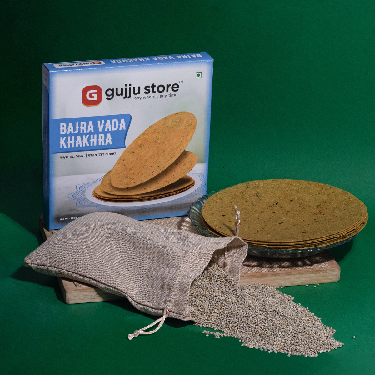 The Gujju Stores Bajra Vada khakhra is a delicious blend of whole wheat flour and millet flour with fresh green chilli and seasoned with sesame seeds, cumin seeds, dehydrated fenugreek leaves and basic Indian spices. We use freshly ground flours and the best quality ingredients sourced mindfully for our variety pack snacks. You can happily end your mid-evening craving with our delicious and hygienic bajra vada khakhra which you can pair with a tangy pickle.