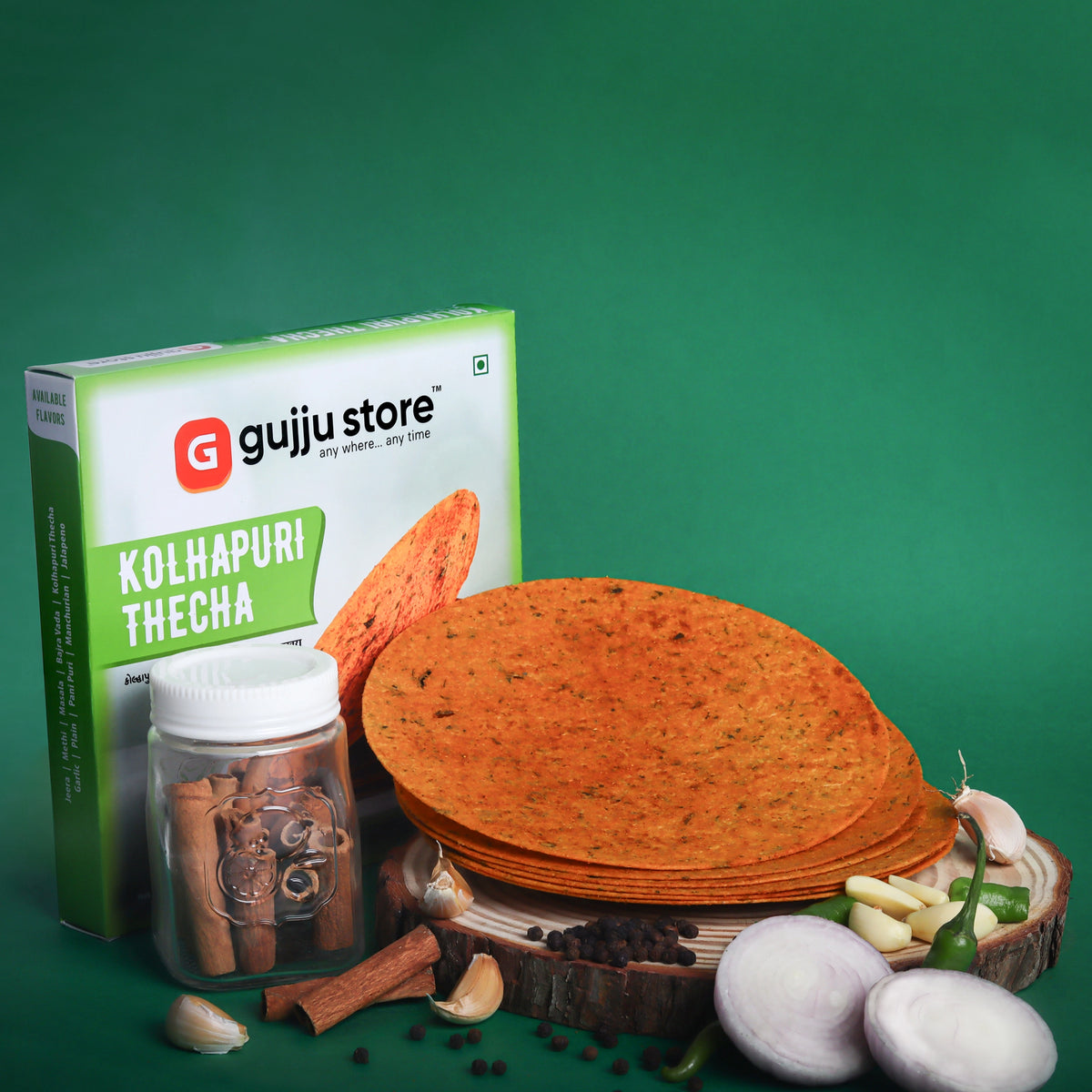 If you are someone who has spicy taste buds, the Gujju Store Kolhapuri Thecha Khakhra is all you must be looking for. It is a unique khakhra in our Gujarati snack combo, that blends the authentic taste of Maharashtra with the basic essence of Gujarat. Spicy flavour in the crunch of khakhra is all set for your mood uplift. The specially selected Indian spices like Onion, Garlic, Ginger, Cloves, Cinnamon, Cumin, Black Pepper, Bay Leaf, Dry Coconut, Javitri, Shahi Jeera and Dry Fenugreek are blended together, and khakhras are made with love and hygiene to give you a supreme fusion taste of Maharashtra and Gujarat.