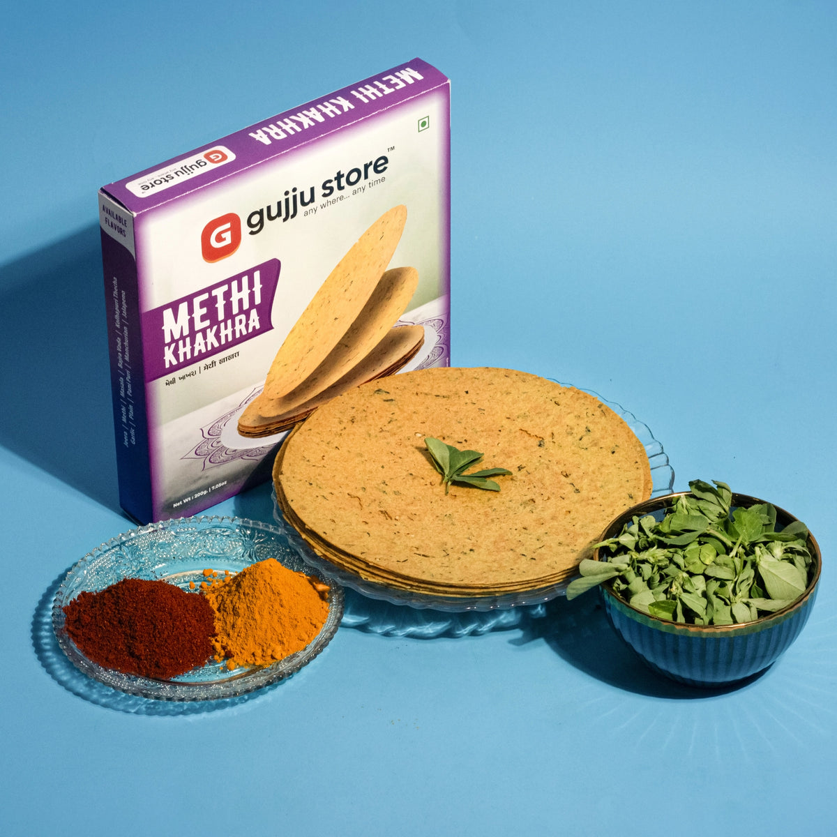 Our Gujju Store Methi Khakhra is thin and crisp, made of whole wheat flour, dried fenugreek leaves and sesame seeds with the goodness of Indian spices. You can easily pair your cup of tea with our hygienic and fresh combo pack khakhra. In fact, one can have our no preservatives khakhra at any time of the year, whether it's winter's immediate small fits of hunger or a craving to eat something during monsoon. You can easily enjoy it with a pickle or some chutney guilt-free.