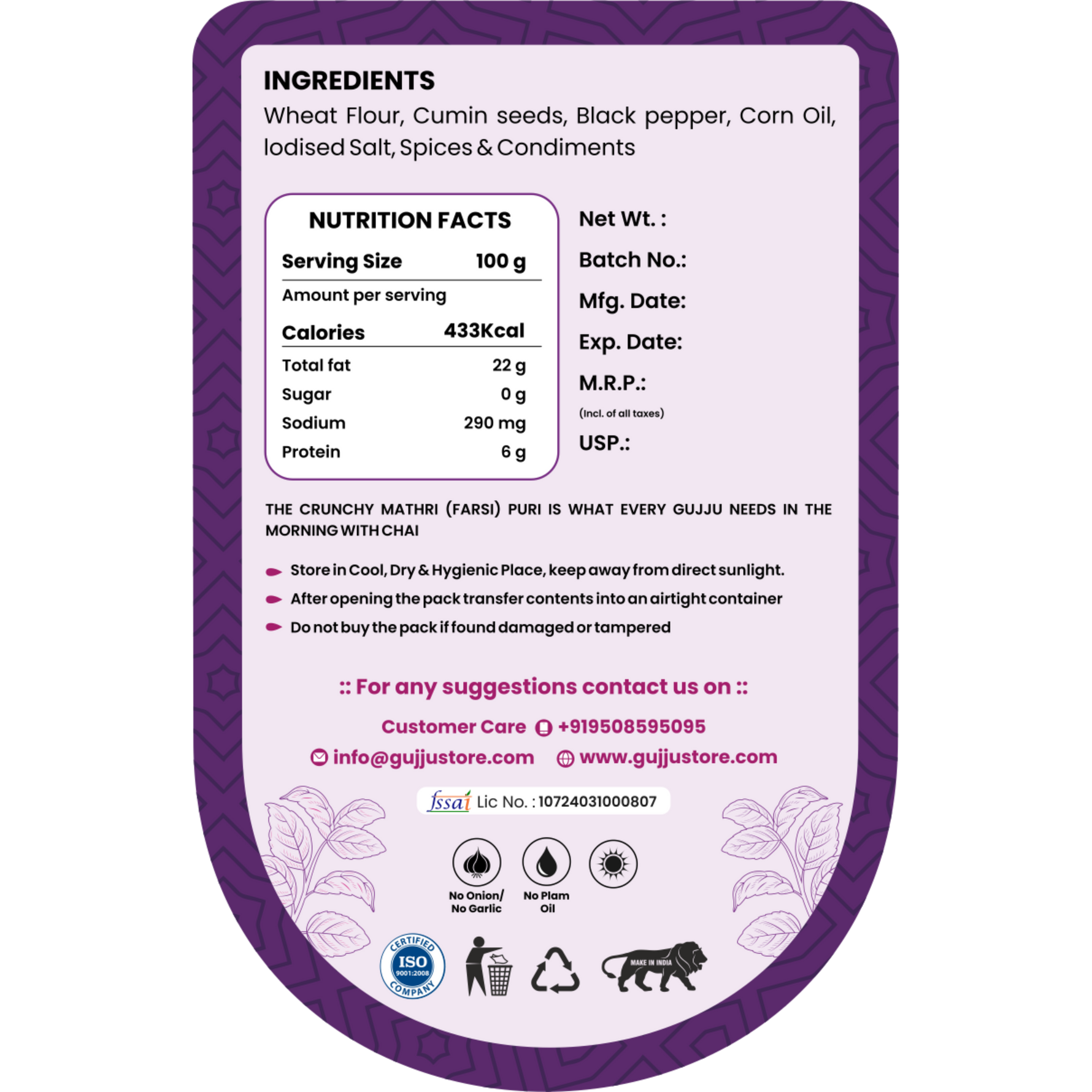 Our Roasted Farsi Puri brings you the same classic Gujarati flavor you love โ now baked to perfection, not fried. Each bite is light, flaky, and full of authentic taste, made using 100% natural ingredients with zero preservatives.