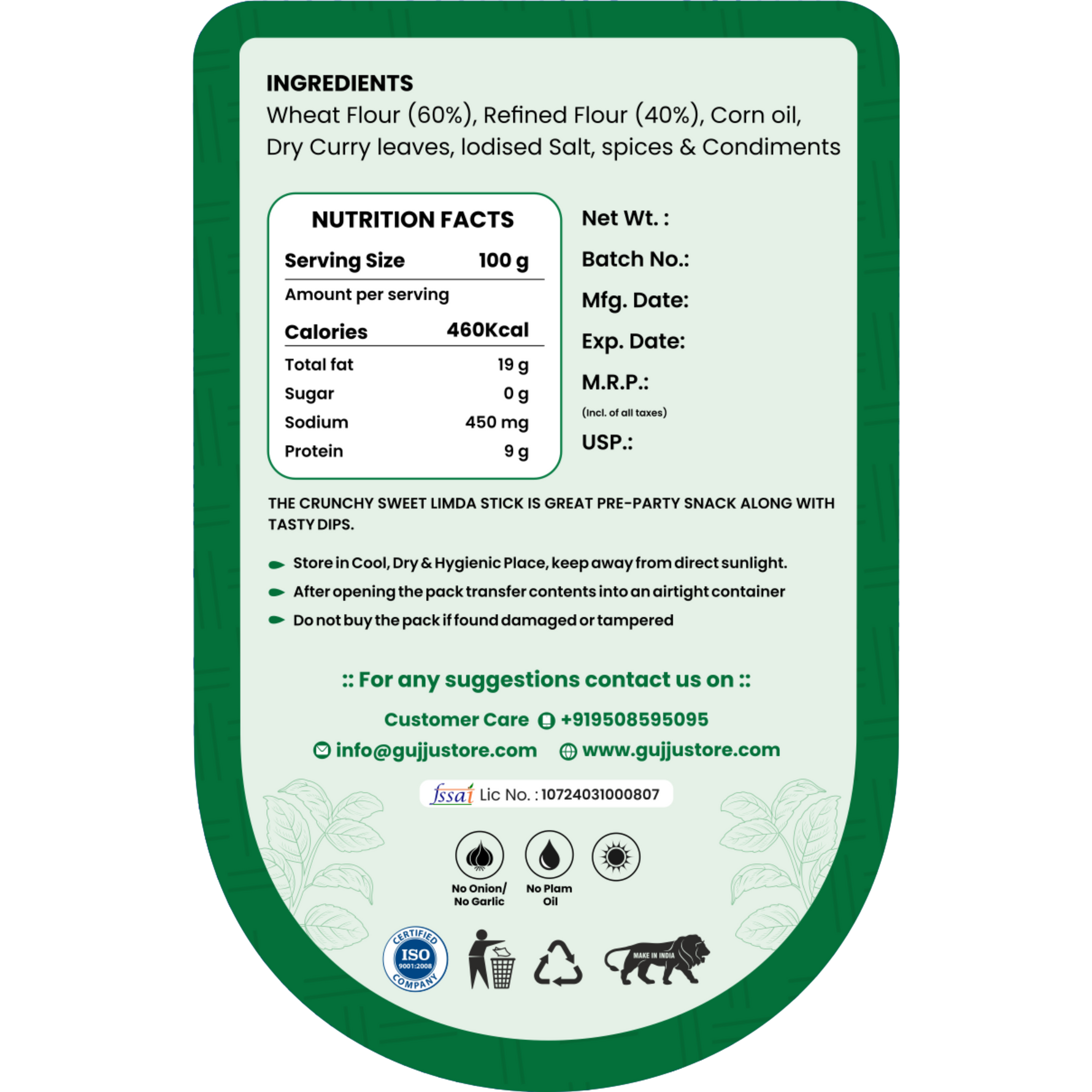 Our Roasted Sweet Limda Stick combines the earthy aroma of limda (neem leaves) with a hint of natural sweetness — creating a crunchy, baked, and guilt-free snack you’ll love with every bite.