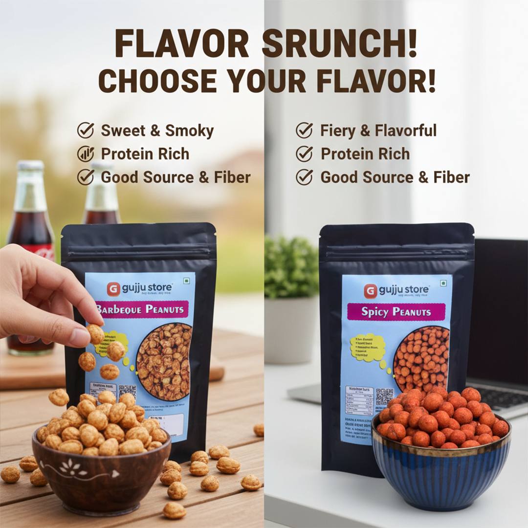 Barbeque Coated Peanuts & Spicy Peanut Bomb Combo – Double the Crunch, Double the Flavor | Gujju Store | 90g. Each