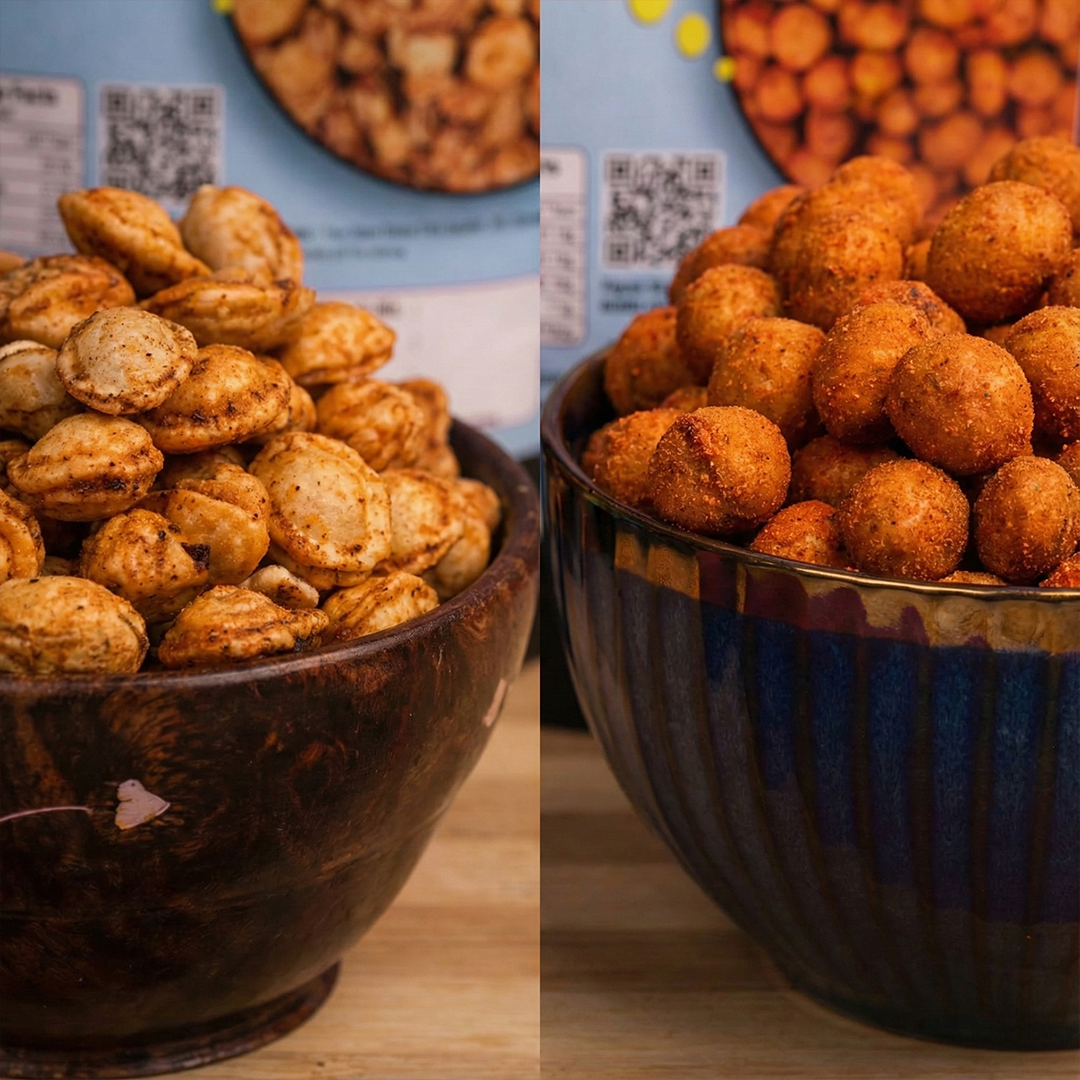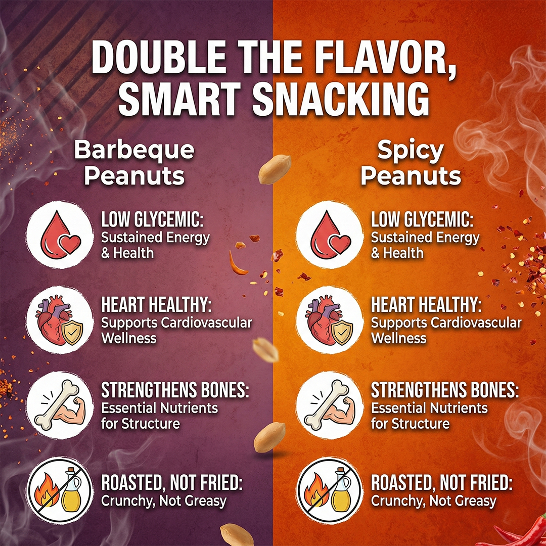 🌶️ Spicy Peanut Bomb – A fiery explosion of heat, featuring peanuts coated in rice flour, besan, chili powder, onion-garlic powder, and salt, delivering a bold, spicy crunch.