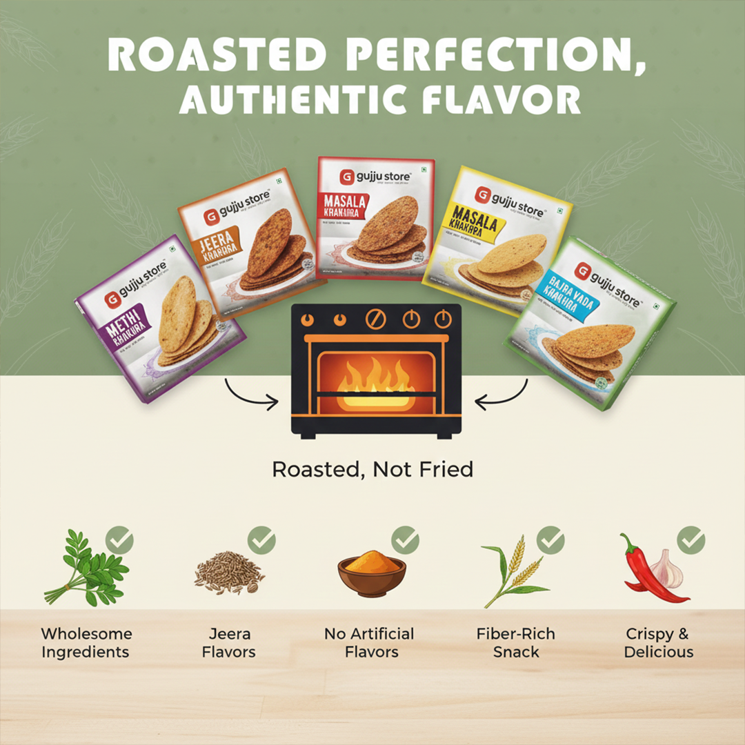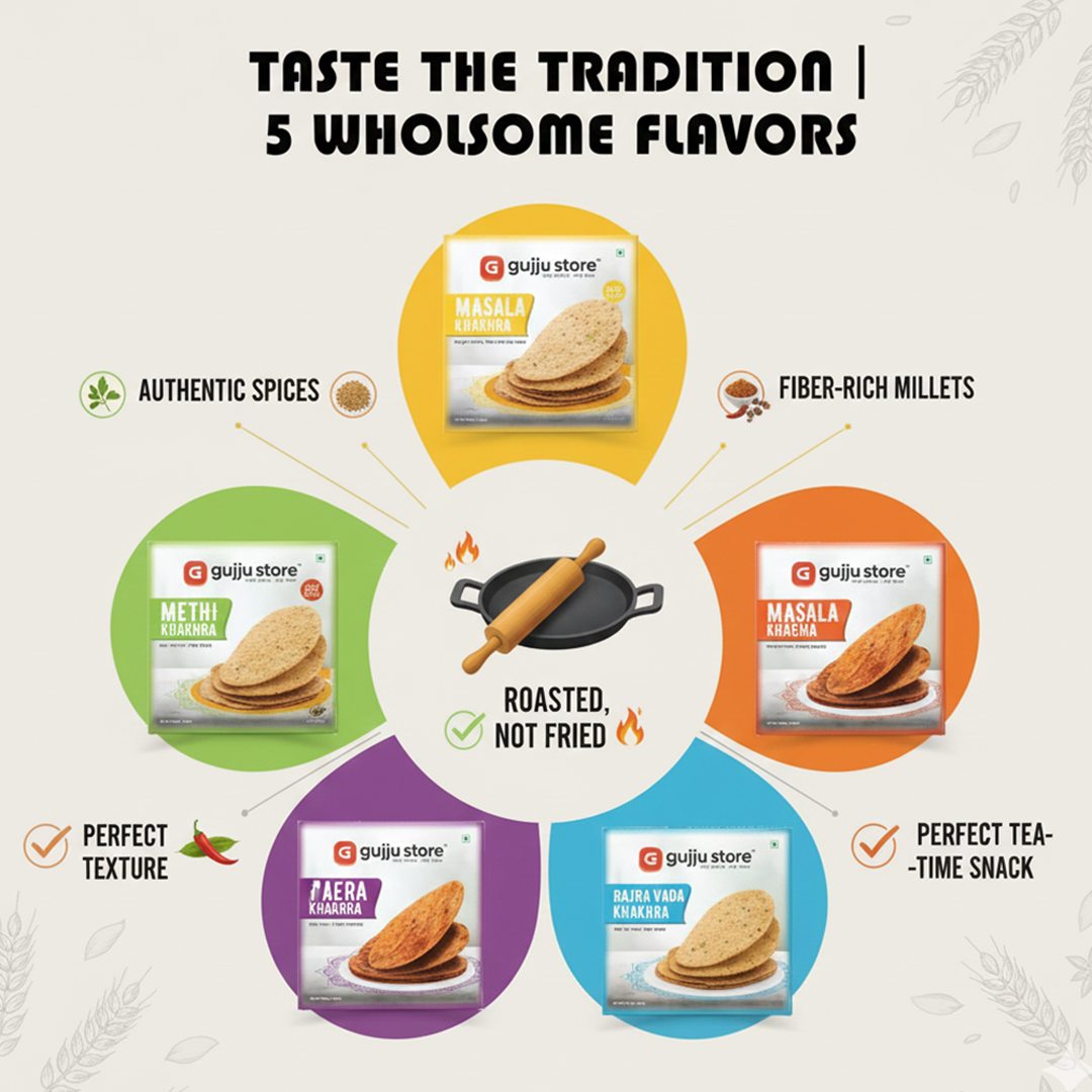 It happens many times that our stomachs are full but we still crave for something to munch on. So, whether it's your mid-evening snacking or a guilt-free breakfast option, our unique flavoured Gujju Store khakhra combination is here for you. This mixed flavour khakhra pack is FSSAI-certified without any added preservatives or artificial flavours. Each and every flavour is specifically curated to satiate all your cravings and midnight pangs of hunger.